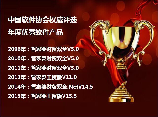 中國軟件行業(yè)協(xié)會舉辦的2015年度軟件產品推優(yōu)評選活動揭曉,經過了申報、技術資料審核、專家評審等過程,管家婆工貿版V15.5榜上有名,并榮膺“年度優(yōu)秀軟件產品”稱號。至此,管家婆財貿雙全和工貿版產品已連續(xù)多年獲此殊榮。